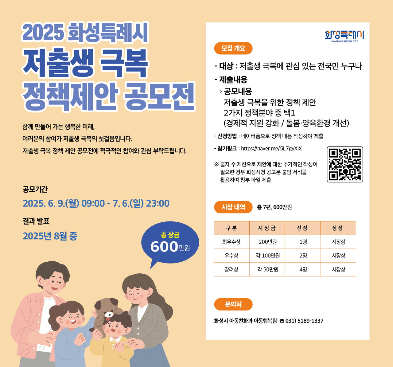 [헤럴드경제(화성)=박정규 기자]화성특례시(시장 정명근)가 저출생 문제 해결을 위한 시민들의 창의적인 아이디어를 발굴하고자 ‘2025년 화성시 저출생 극복 정책 제안 공모전’을 개최한다.