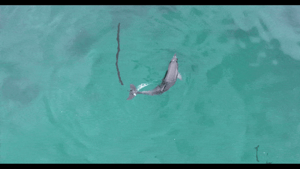 | 9일 제주시 구좌읍 한동리 해상에서 발견된 남방큰돌고래 ‘행운’이의 꼬리에 폐어구가 얽혀있는 모습. [다큐제주, 제주대학교 고래·해양생물보전연구센터 제공] |