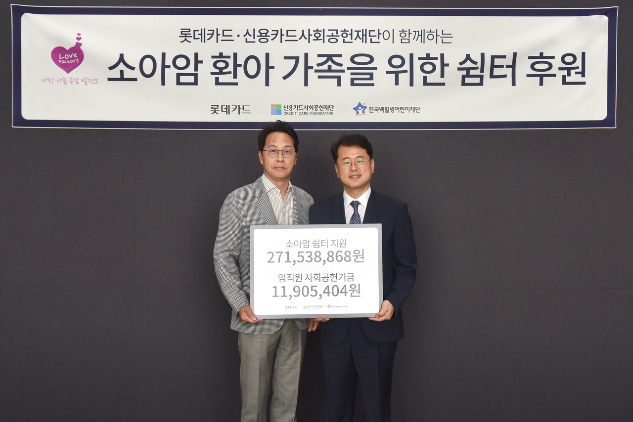 이날 전달식은 롯데카드 조좌진 대표이사와 한국백혈병어린이재단 서선원 사무총장이 참석한 가운데 진행됐다. 롯데카드는 소아암 환아 및 가족을 돕기 위해 2018년부터 신용카드사회공헌재단과 함께 ‘소아암 쉼터’를 지원해 왔다. 이번 후원금은 2억7153만8868원으로, 일곱 번째 소아암 쉼터 개소에 이용된다.