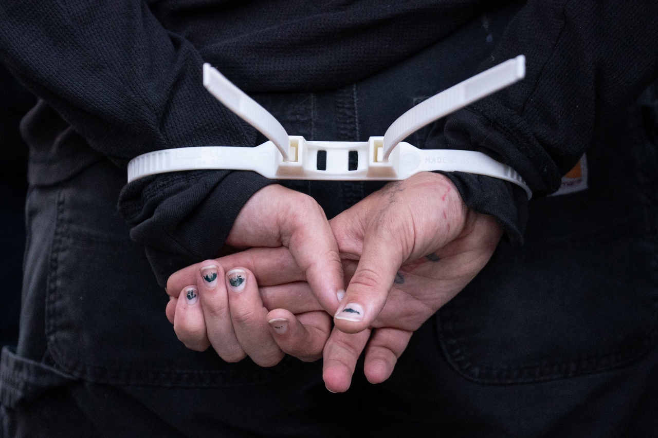 | 10일(현지시간) 미 뉴욕에서 트럼프 대통령의 불법 이민 단속에 반발하는 시위대 일부가 경찰에 검거돼 케이블 타이로 만든 수갑에 연행되고 있다. [AFP] |