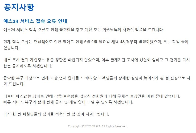앞서 예스24는 홈페이지와 애플리케이션에 올린 공지사항에서 ‘현재 접속 오류는 랜섬웨어로 인한 장애로 6월 9일 월요일 새벽 4시경부터 발생했으며 복구 작업 중에 있다’며 ‘내부 조사 결과 개인정보 유출 정황은 확인되지 않았다’고 밝혔다.