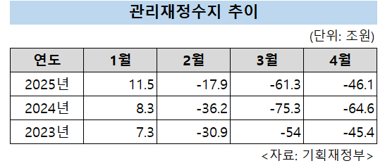 [헤럴드경제=김용훈 기자] 올해 1~4월 나라살림 적자 규모가 46조1000억원을 기록했다. 올해 1분기(1~3월)나 작년 동기 대비 개선됐지만 역대 세 번째로 많은 수준이다.