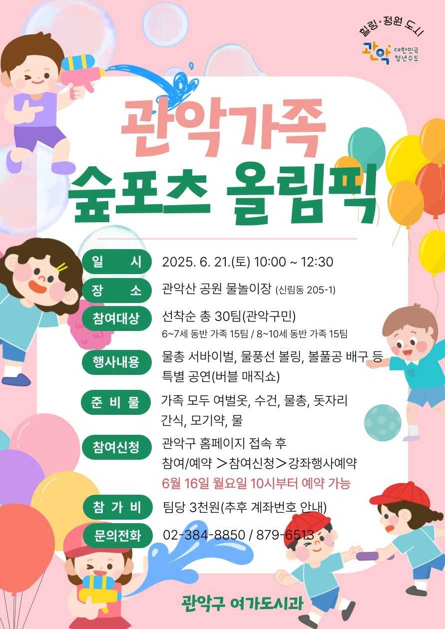 참가 대상은 6세~10세 아동을 동반한 관악구 거주 가족 30팀이며, 참가비는 팀 당 3000원이다.
