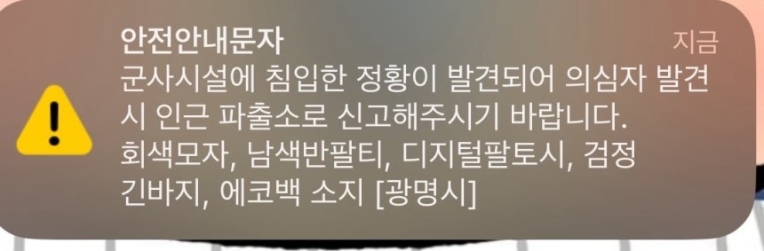 광명시는 같은날 재난 문자를 통해 “군사시설에 침입한 정황이 발견돼 의심자 발견 시 인근 파출소에 신고해달라”고 당부했다. 용의자는 회색 모자, 남색 반소매 티, 디지털 팔토시, 검정 긴바지 차림에 에코백을 소지 중이라고 광명시는 전했다.