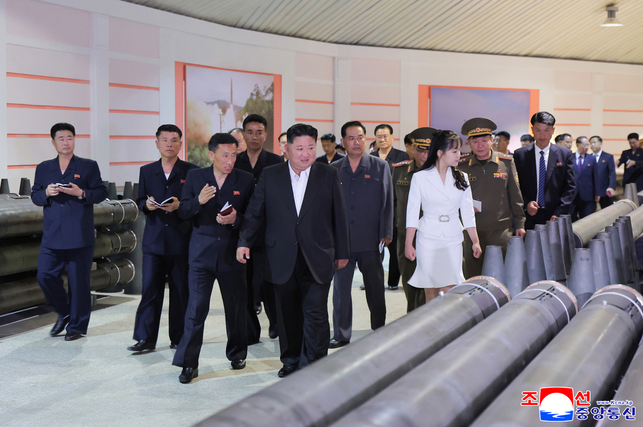 북한 매체들이 공개한 사진을 보면 김정은의 딸 주애도 진수식 때와 동일한 복장으로 군수공장을 함께 찾았다.