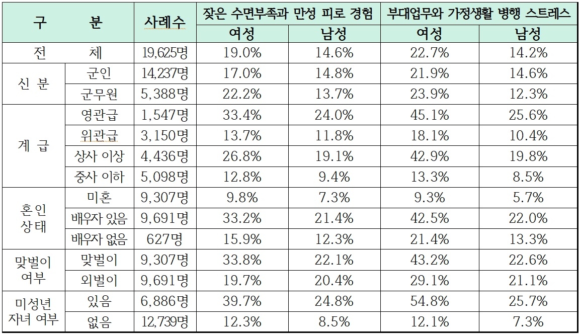 부대-가정생활 병행으로 인한 신체적·정신적 어려움은 여성간부 20% 내외, 남성 간부는 약 15%가 ‘경험한다’고 응답해 군 내 여성이 남성보다 일·가정 양립에서 보다 어려움을 겪고 있는 것으로 확인됐다.