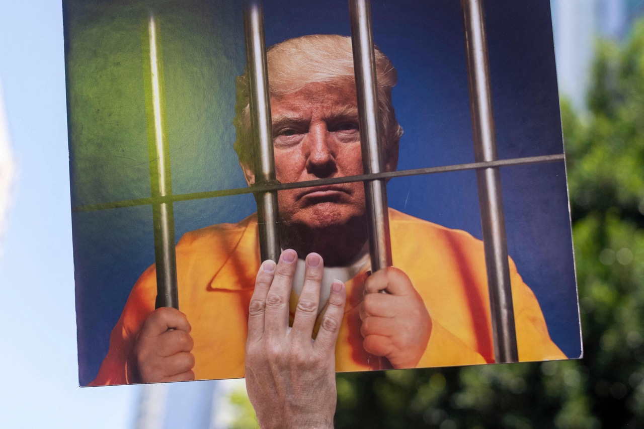 | 지난 14일(현지시간) 미국 캘리포니아주 로스앤젤레스 시내에서 열린 ‘노 킹스’ 전국 집회에서 시위대가 트럼프 행정부에 반대하는 시위를 벌이는 동안 감옥 뒤에서 도널드 트럼프 대통령의 사진을 들고 있다. [AFP] |