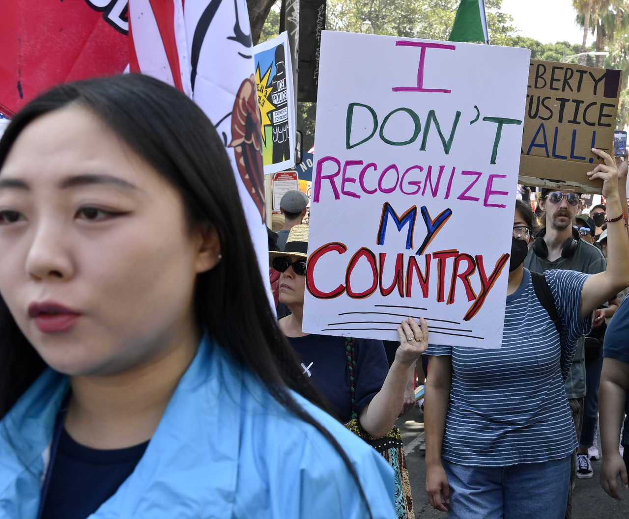 | 지난 14일(현지시간) 14일 미국 로스앤젤레스(LA) 시청 앞에서 수천 명의 시위대가 트럼프 행정부의 정책에 항의하고 있다.[UPI] |