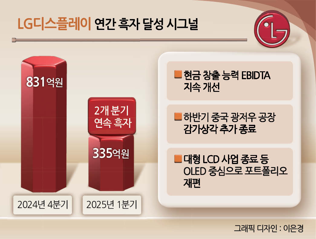 금융투자업계에서는 올해 LG디스플레이의 연간 영업이익 흑자를 유력하게 전망하고 있다. 사상 처음으로 대형 OLED 패널 사업의 흑자가 기대되는 가운데, 하반기 중국 광저우 공장의 감가상각이 일부 종료되면서 수익성 개선이 가속화될 것으로 예상된다. LG디스플레이는 앞서 중국 TCL 자회사 CSOT에 광저우 LCD 공장을 매각해 약 2조2000억원의 자금을 확보했다. 이중 일부는 재무구조 개선에, 일부는 OLED 사업 투자에 투입될 예정이다.