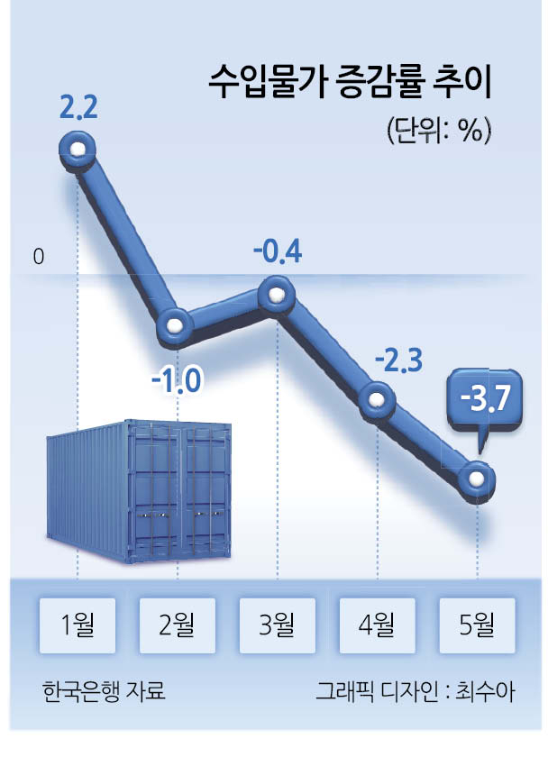 17일 한국은행이 발표한 수출입물가지수 및 무역지수 통계에 따르면 5월 수입물가(원화기준)는 지난달 대비 3.7% 하락했다. 지난 2023년 11월(-4.3%) 이후 가장 큰 하락 폭이다. 수입물가는 지난 2월(-1.0%)부터 떨어지기 시작해 5월까지 벌써 4개월 연속 하락했다. 수입물가는 지난해 같은 달과 비교해도 5.0%나 떨어졌다.
