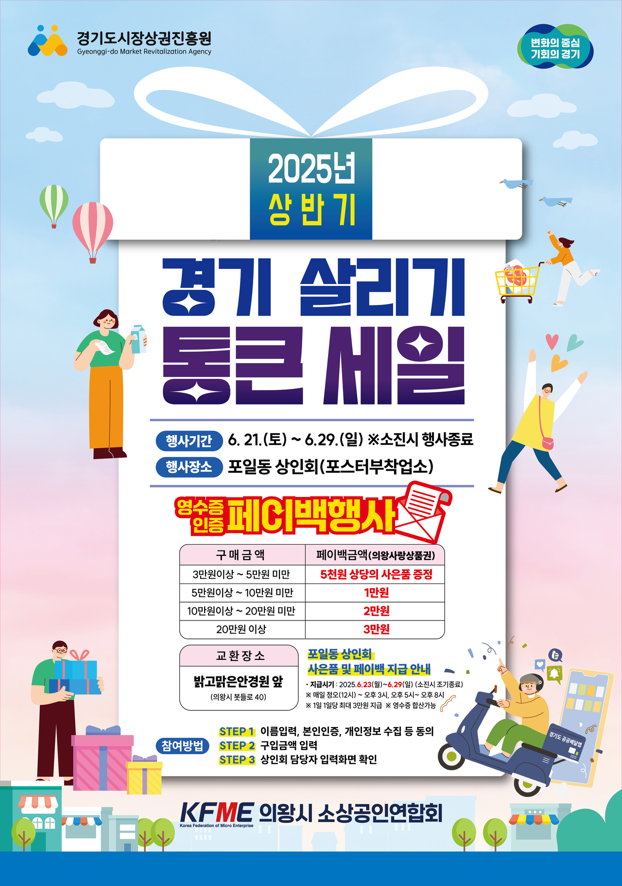 6월 21일~29일 진행되는 ‘통큰 세일’기간 동안에 행사 포스터가 부착된 업소를 대상으로 소비한 후 구매영수증을 인증하면, 금액대별 1일 1인당 최대 3만원까지 페이백 또는 사은품을 받을 수 있다.