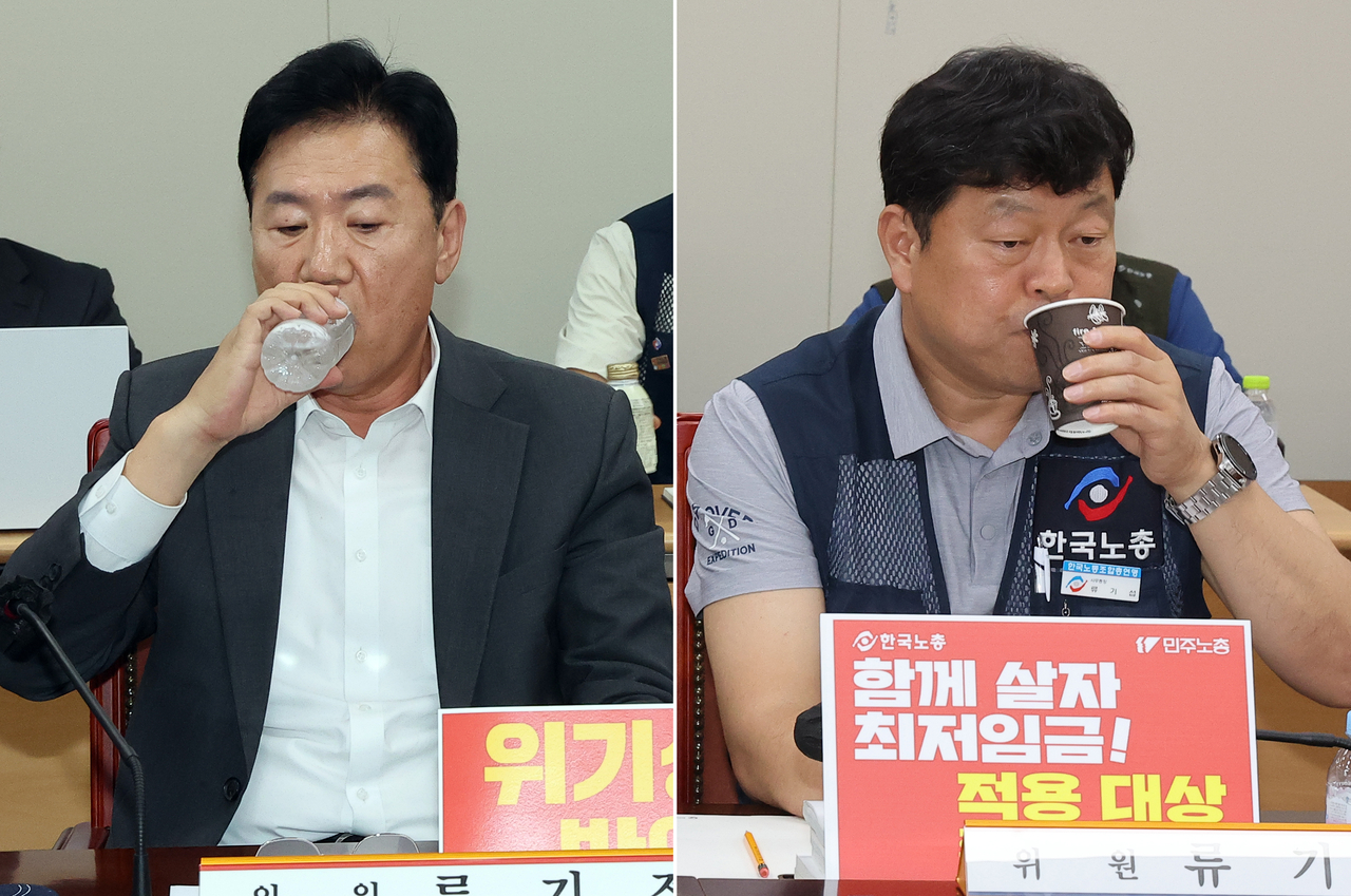 | 최저임금위원회 사용자위원인 류기정 한국경영자총협회 전무(왼쪽)와 근로자위원 류기섭 한국노총 사무총장이 17일 정부세종청사에서 열린 최저임금위원회 제5차 전원회의에서 각각 목을 축이고 있다. [연합] |