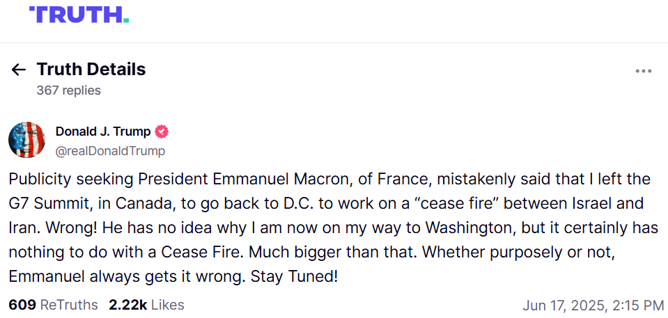 이날 트럼프 대통령은 자신의 소셜미디어(SNS) 트루스소셜에 “에마뉘엘 마크롱 (프랑스) 대통령이, 내가 캐나다에서 열린 G7 정상회의를 떠나 워싱턴DC로 돌아가 이스라엘과 이란 간 ‘휴전’ 협상을 하러 간 것이라고 잘못 말했다”며 “틀렸다! 그는 내가 지금 왜 워싱턴으로 향하는지 전혀 모른다”고 말했다.