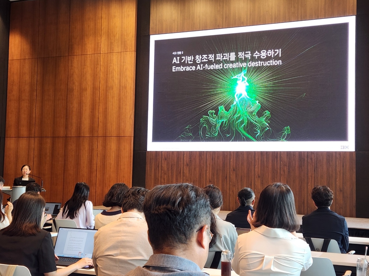 | 김현정 한국IBM 컨설팅 대표(왼쪽)가 17일 서울 영등포구 소재 IFC에서 열린 간담회에서 발언하고 있다. 고재우 기자 |