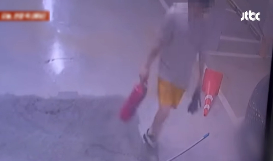 | 경기 성남의 한 오피스텔 주차장에서 소화기를 들고 이웃의 차량을 훼손하는 남성. [JTBC ‘사건반장’ 영상 캡처] |