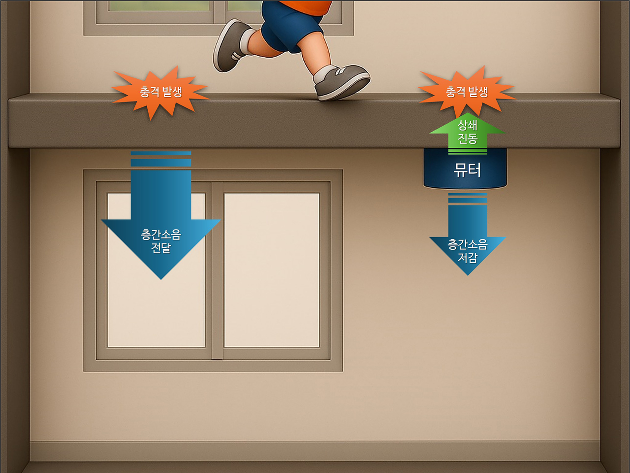 진동센서와 신호처리 장치, 진동제어 장치인 ‘뮤터(Muter)’로 구성된 시스템은 슬라브의 하부에 설치된다. 층간소음은 천장이나 벽을 타고 위층에서 아래층에 전달되는 충격으로 인한 진동에 의해 발생하는데, 위층에서 충격이 발생하면 진동센서가 이를 감지하게 된다. 신호처리 장치는 진동센서로부터 받아들인 충격을 전기신호로 바꿔 ‘뮤터’에 전달하고, ‘뮤터’는 그 충격을 상쇄하는 진동을 발생시켜 층간소음을 저감한다.