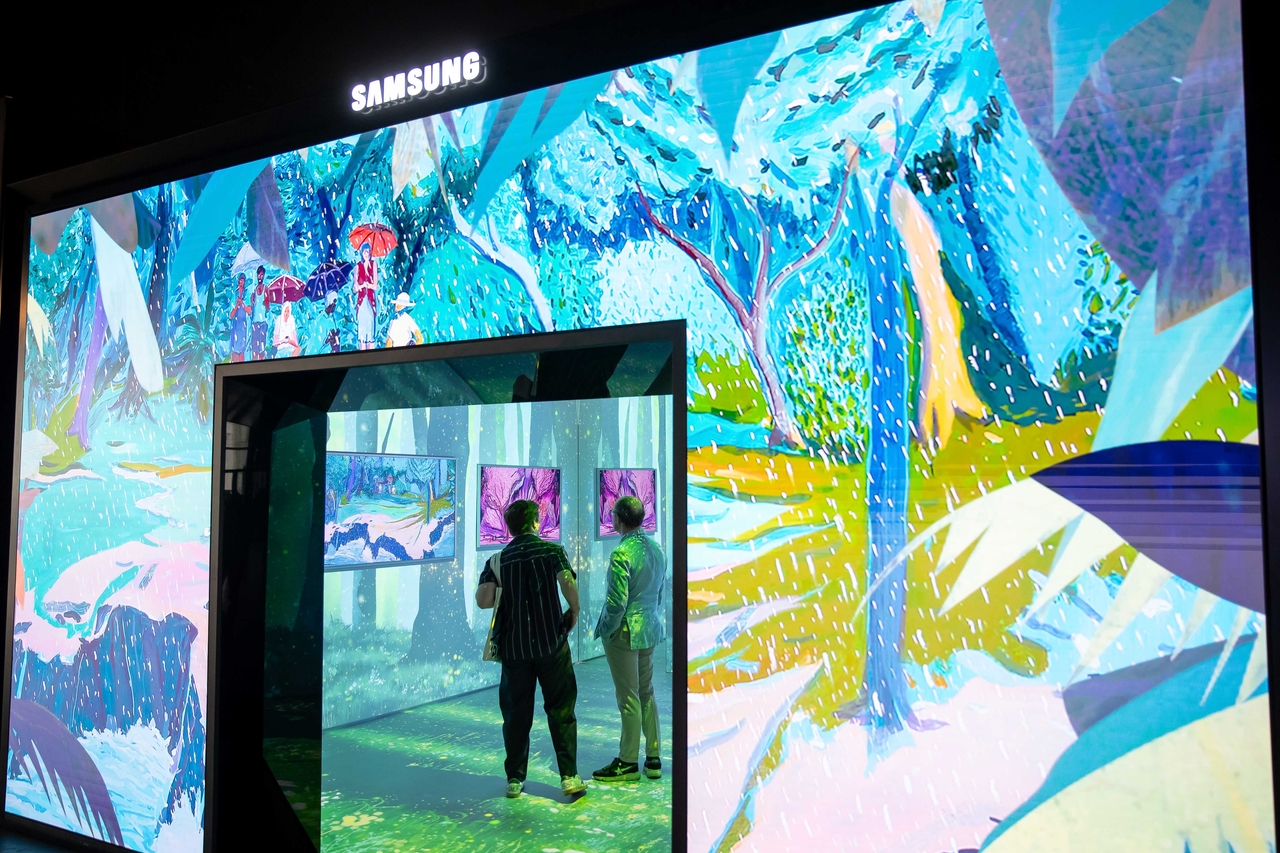 | 관람객들이 삼성전자의 디지털 아트 체험 공간인 삼성 라운지 ‘아트큐브(ArtCube)’ 전시장을 구경하고 있다. [삼성전자 제공] |