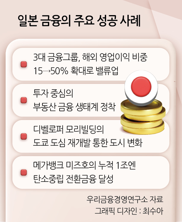 먼저 일본 3대 금융그룹인 미쓰비시UFJ파이낸셜그룹(MUFG), 스미토모미쓰이 파이낸셜그룹(SMFG), 미즈호가 해외사업 확장을 통해 장기불황과 저성장을 극복한 과정에 주목했다. 이들은 초저금리·양적완화 정책 속에서 수익성 저하와 자산운용의 어려움을 겪었지만 글로벌사업에서 해답을 찾았다. 이에 해외 영업이익이 2006년 대비 2023년 5배 급증하고 전체 영업이익 중 해외 부문이 차지하는 비중이 15%에서 50%로 급격히 커지며 재기에 성공했다.