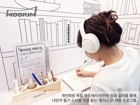 | 관람객이 무림페이퍼 ‘종이오감’ 공간에서 손글씨를 쓰며 청음설비를 통해 자신만의 필기소리를 듣고 있다. |