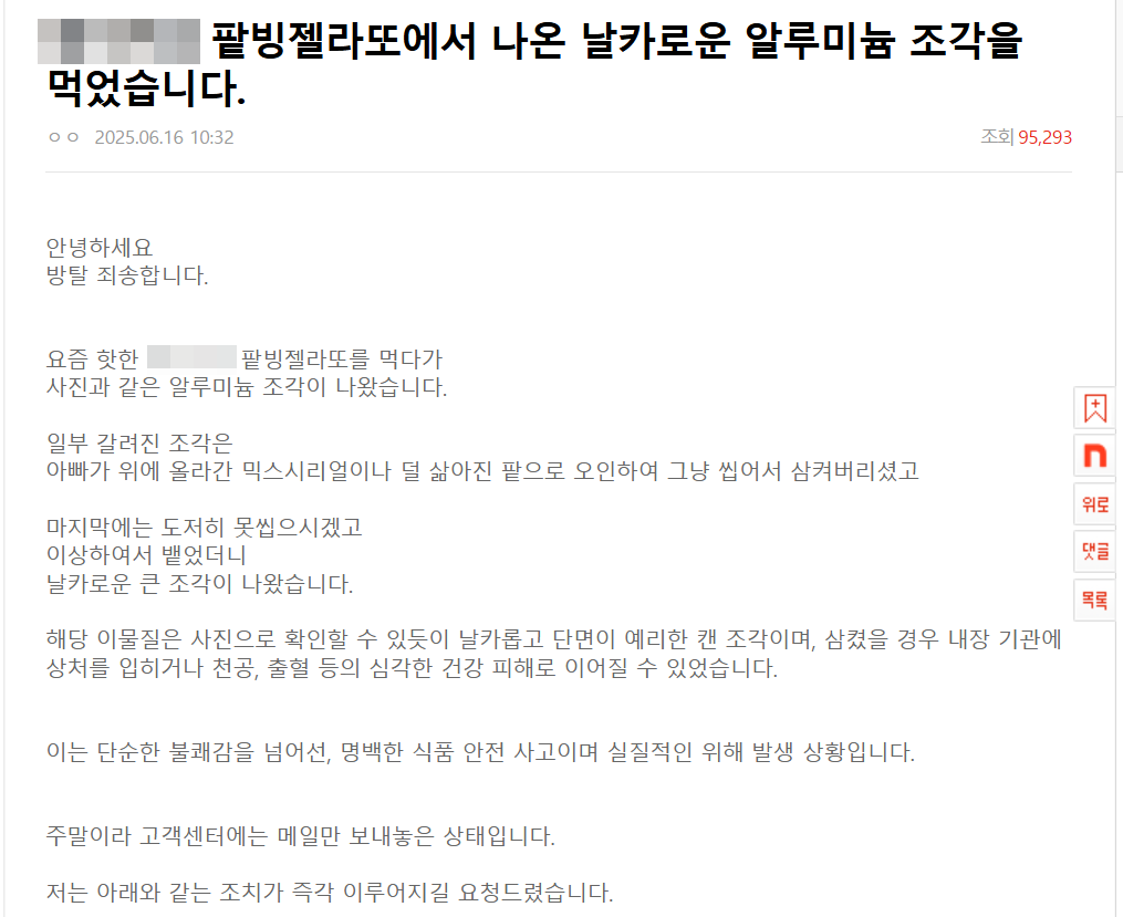 이어 글쓴이는 해당 커피체인점 고객센터에 메일을 보내 “이물질 혼입 경위 보고,동일 제품 및 유통 전과정 전수 조사,공식적인 사과 및 적절한 보상과 의료비 지원을 요청했다”며 “동일한 피해가 생기지 않았으면 한다”고 공개 이유를 밝혔다.