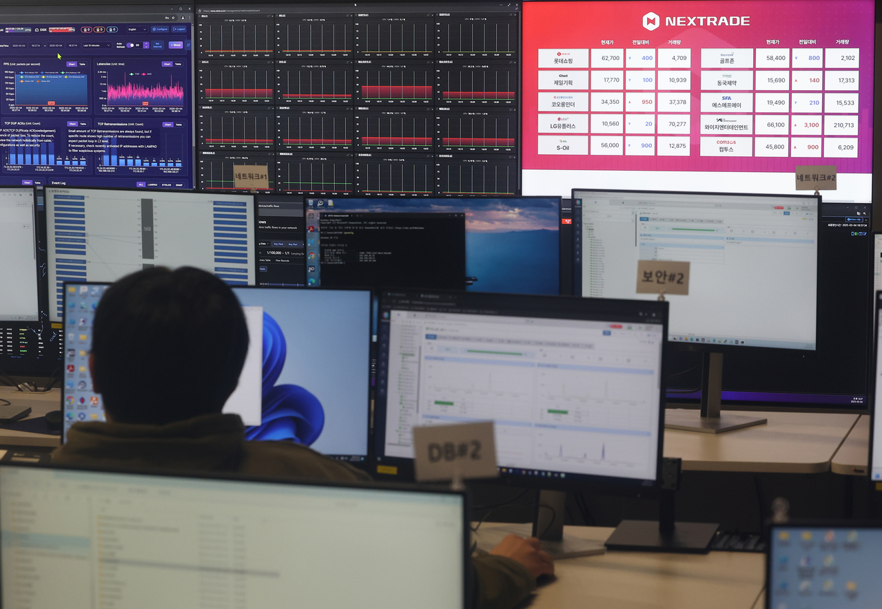 | 애프터마켓이 열린 지난 3월 오후 서울 영등포구 넥스트레이드 사무실 모니터에 거래 중인 10개 종목이 표시돼 있다. [연합] |