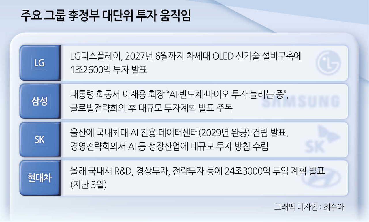 LG그룹이 이재명 정부 출범 이후 처음으로 국내 조 단위 투자의 물꼬를 트면서 향후 주요 대기업이 내놓을 국내 투자계획에 관심이 쏠리고 있다.