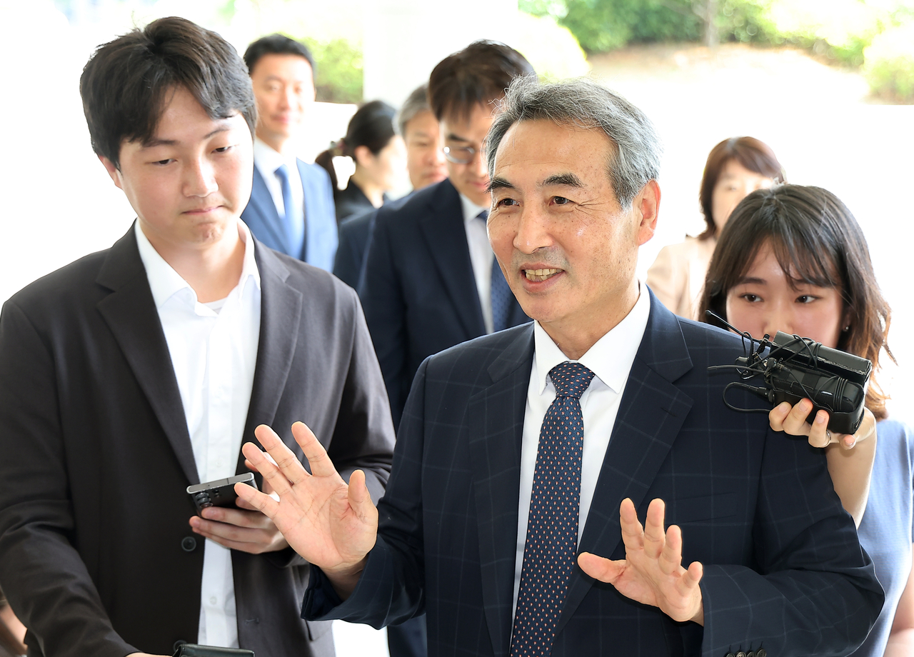 | 윤석열 전 대통령의 부인 김건희 여사에 대한 의혹을 수사할 민중기 특별검사가 박세현 서울고등검찰청장 면담을 위해 18일 서울 서초구 서울고검으로 향하고 있다. [연합] |