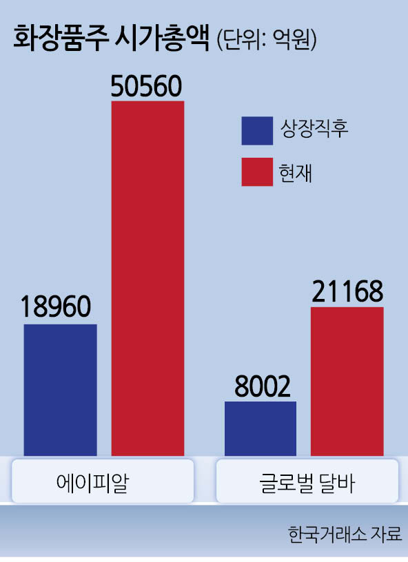 이는 지난해 2월 상장 당시 몸값인 1조8960억원보다 몸값이 2.5배 이상 불어나며 국내 화장품 업계 시총 2위권까지 위협하고 있다.