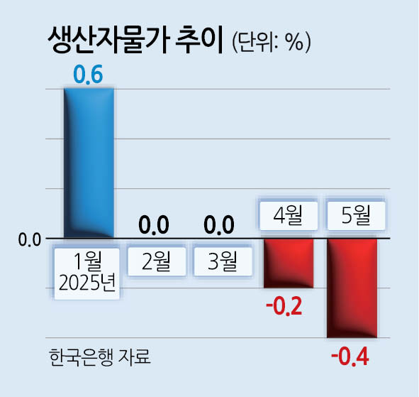 20일 한국은행이 발표한 생산자물가지수(잠정)에 따르면 5월 생산자물가는 지난달과 비교해 0.4% 하락했다. 2023년 11월(-0.4%) 이후 18개월 만에 하락 폭이 가장 컸다. 생산자물가는 4월(-0.2%)부터 낮아지기 시작해 5월까지 2개월 연속 떨어졌다.