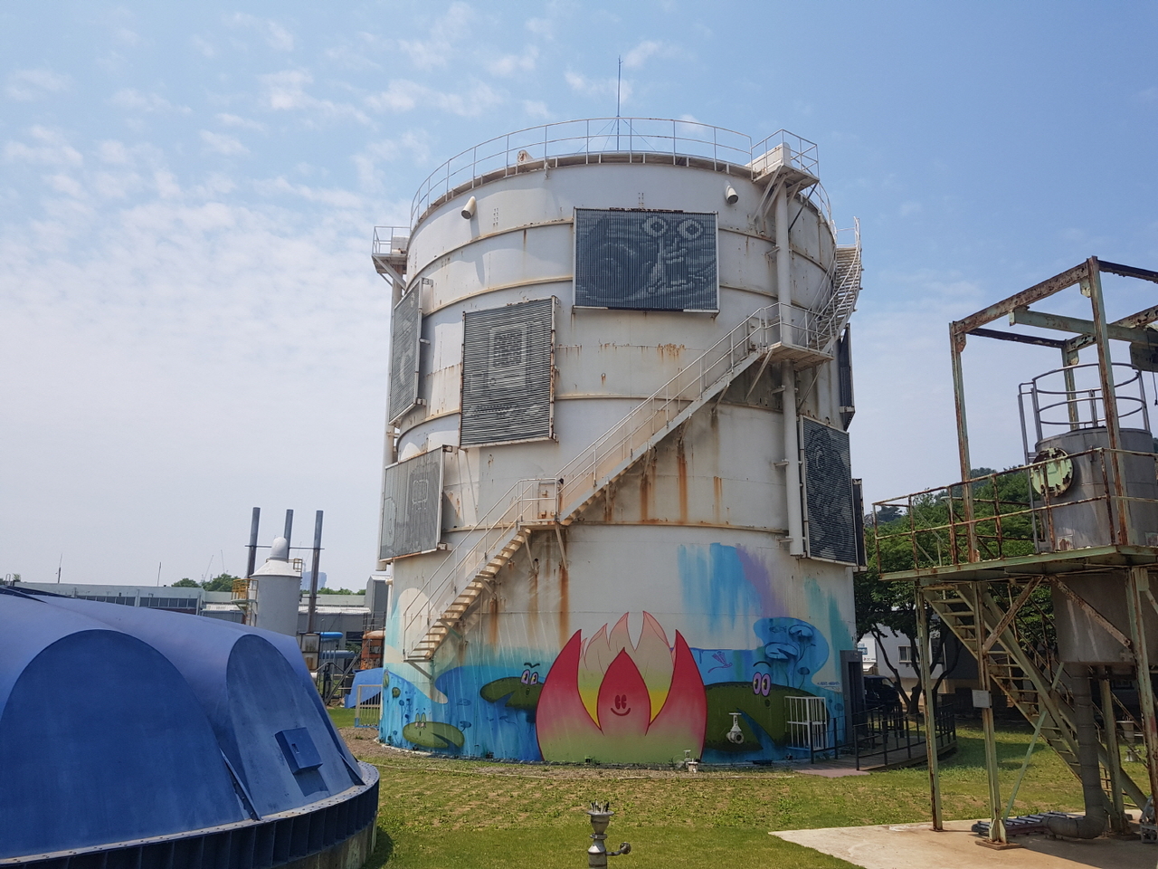 외벽에는 방현우 작가의 대형 설치미술 작품이 배치되어 있는데, 수년이 지나며 곳곳에 녹이 슬었다. 이런 질감 위에 그래피티 벽화가 추가되면서 높이 17m, 지름 15m에 이르는 대형 가스통의 외벽이 그 자체로 거대하고 빈티지한 미술관이 됐다.