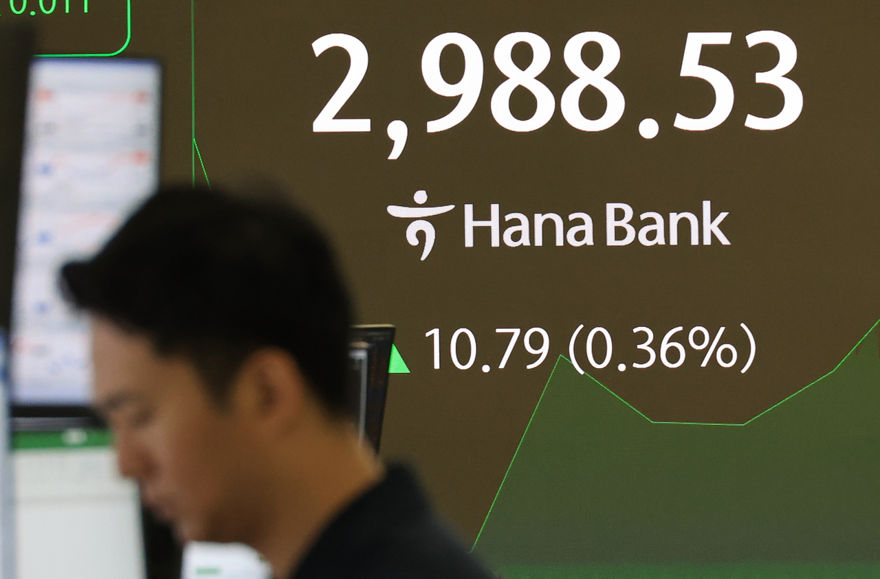 | 20일 서울 중구 하나은행 본점 딜링룸에서 직원이 증시와 환율을 모니터하고 있다. 이날 오전 9시 2분 현재 코스피는 전장보다 1.09포인트(0.04%) 오른 2,978.83이다. 지수는 전장보다 8.78포인트(0.29%) 오른 2,986.52로 출발했다. [연합] |