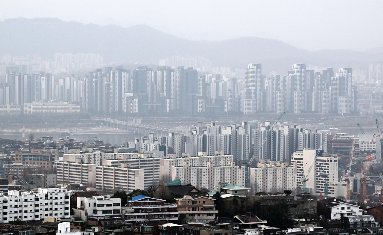 | 가계부채 증가세가 이어지고 있는 가운데 금융위원회가 현재 총부채원리금상환비율(DSR) 규제를 적용받지 않는 전세대출, 정책모기지 등에 대한 DSR 적용을 검토하기로 했다. 사진은 서울 남산에서 바라본 용산구와 서초구 지역의 아파트 모습 [헤럴드경제 DB] |