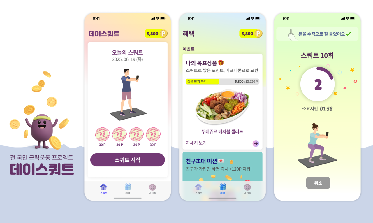 20~30대를 겨냥한 일반적인 피트니스 앱과는 완전히 다른 현상이라는 게 업계 평가다. 성공 비결은 극도의 간단함에 있다. 스마트폰만 들고 스쿼트를 하면 앱이 자동으로 움직임을 인식해 운동 횟수를 측정한다. 하루 목표는 부담 없는 40회(10회씩 4세트). 목표를 달성하면 포인트를 적립해주고, 이를 에너지바나 단백질 음료 등으로 교환할 수 있다.
