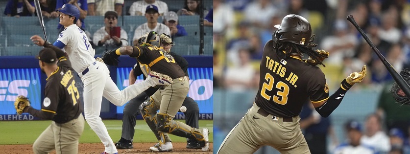 ![다저스 오타니와 샌디에이고 타티스 주니어가 19일(현지시간) 경기 도중 상대투수가 던진 공에 맞고 있다.[AP=연합]](http://heraldk.com/wp-content/uploads/2025/06/ohtani-tatis-hit.jpg)