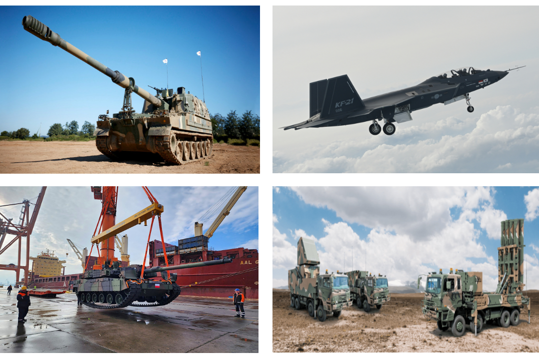 | 맨 위 왼쪽부터 시계 방향 순서대로 한화에어로스페이스 K9 자주포, KAI KF-21, LIG넥스원 천궁Ⅱ, 현대로템 K2 전차. [각 사 제공] |