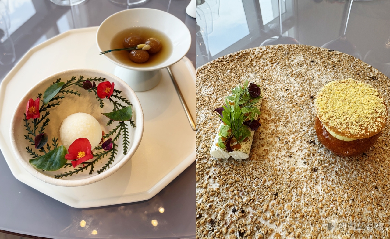 | 대저토마토빙과·수정과(왼쪽), 방아머랭과 된장 캐러멜·옥수수 우메기. 육성연 기자 |