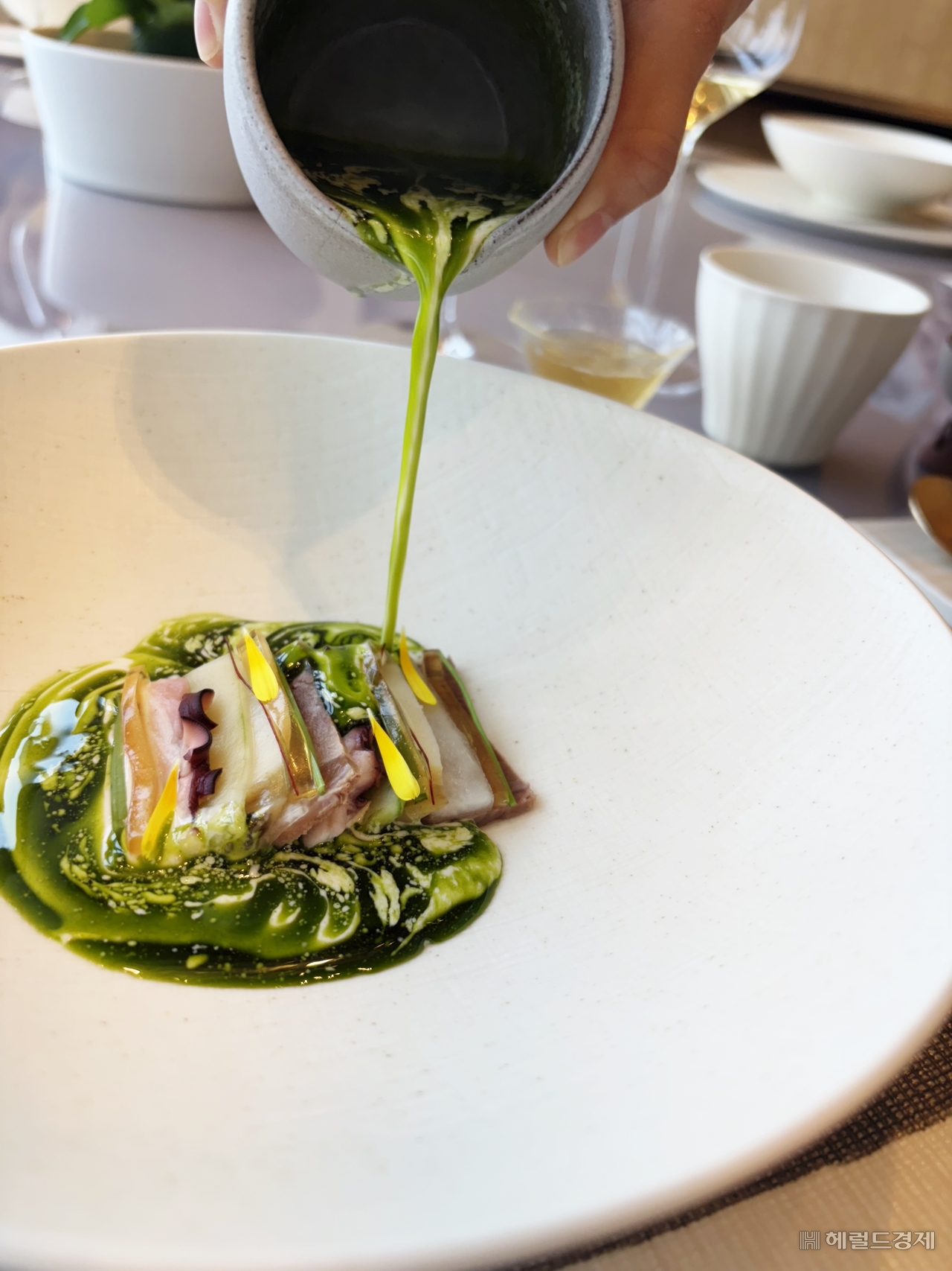 이어 나온 ‘편육냉채와 뵈르 블랑’은 아롱사태와 전복 사이에 누룩소금으로 절인 참외·오이를 끼워 넣었다. 편육의 다소 느끼한 맛을 참외·오이가 새콤하게 잡았다. 누룩소금은 술을 만들 때 나오는 누룩을 소금과 섞은 다음, 말려서 갈아 만든다.