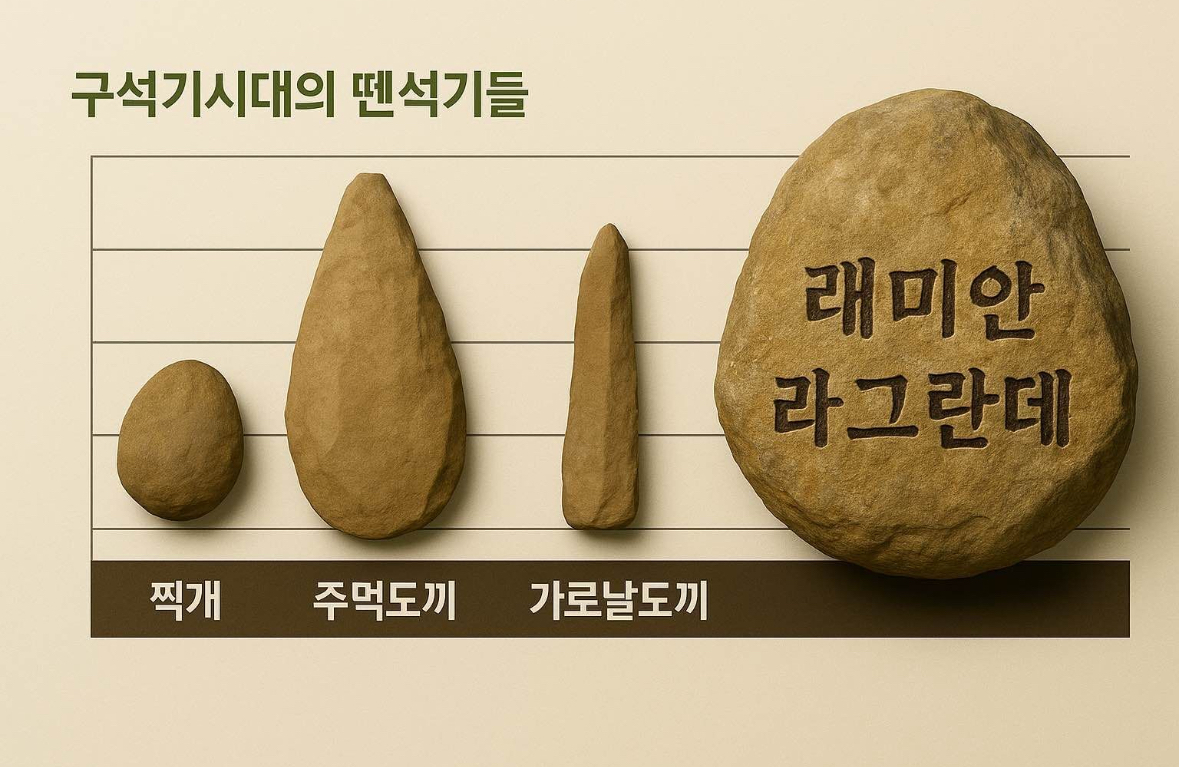 | 서울 동대문구 이문동 ‘래미안 라그란데’에 설치된 투박한 조경석이 구석기시대 뗀석기와 비슷하다며 누리꾼이 제작한 그래픽. [온라인 커뮤니티] |