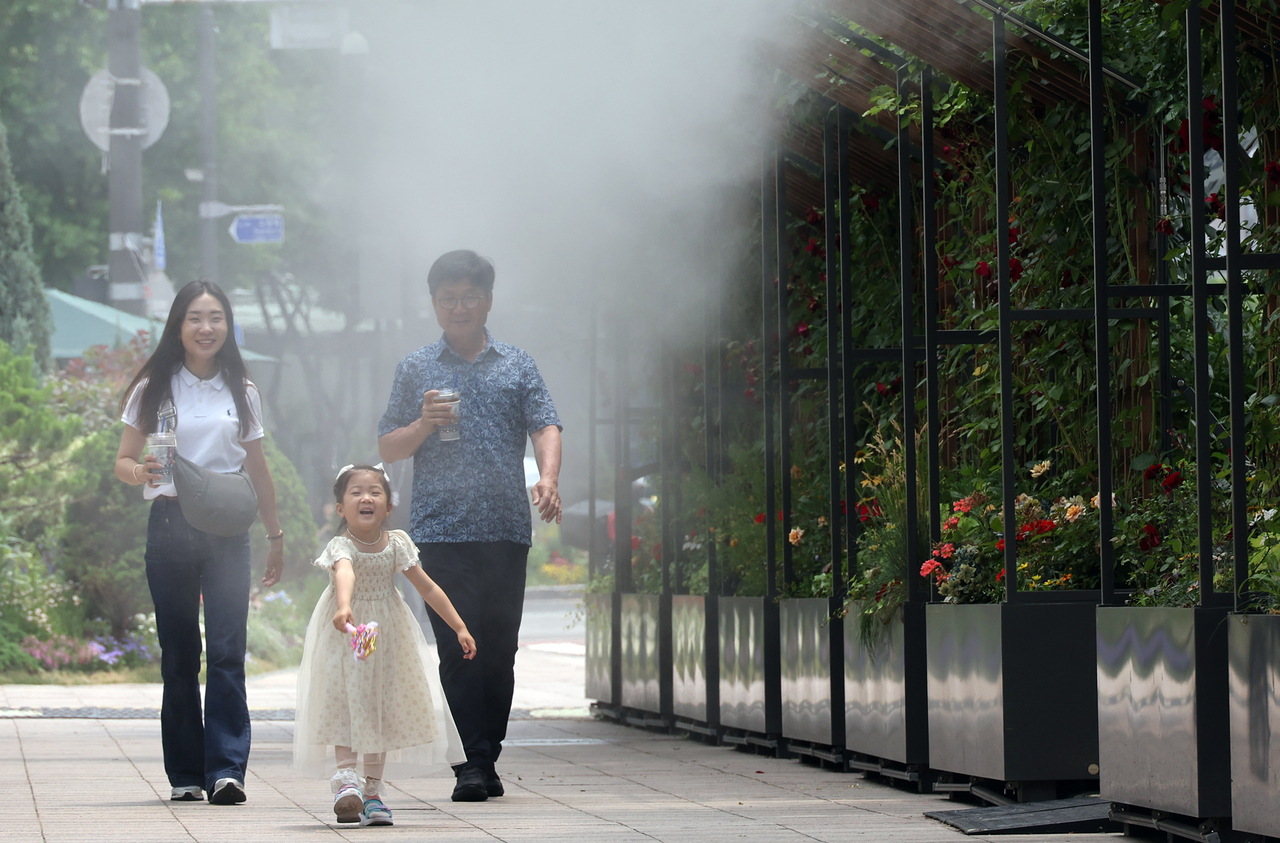 | 낮 기온이 30도를 웃돌고 후텁지근한 날씨가 계속된 지난 17일 서울 중구 서울시청 앞 서울광장에 설치된 쿨링포그가 가동되고 있다. [연합] |