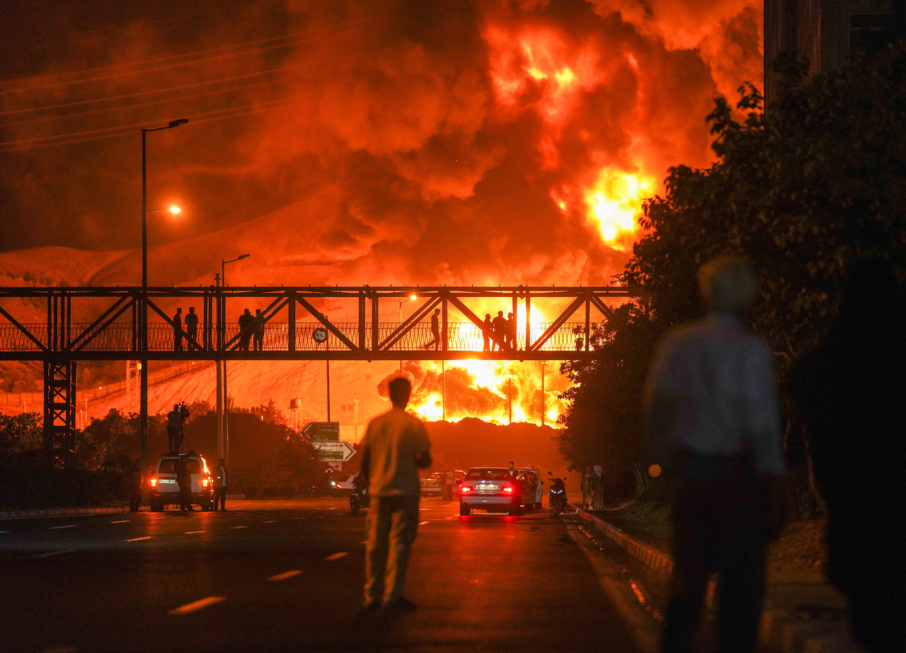| 이란 수도 테헤란 인근의 원유 정제시설이 이스라엘 공습으로 불길에 휩싸인 모습 [UPI] |