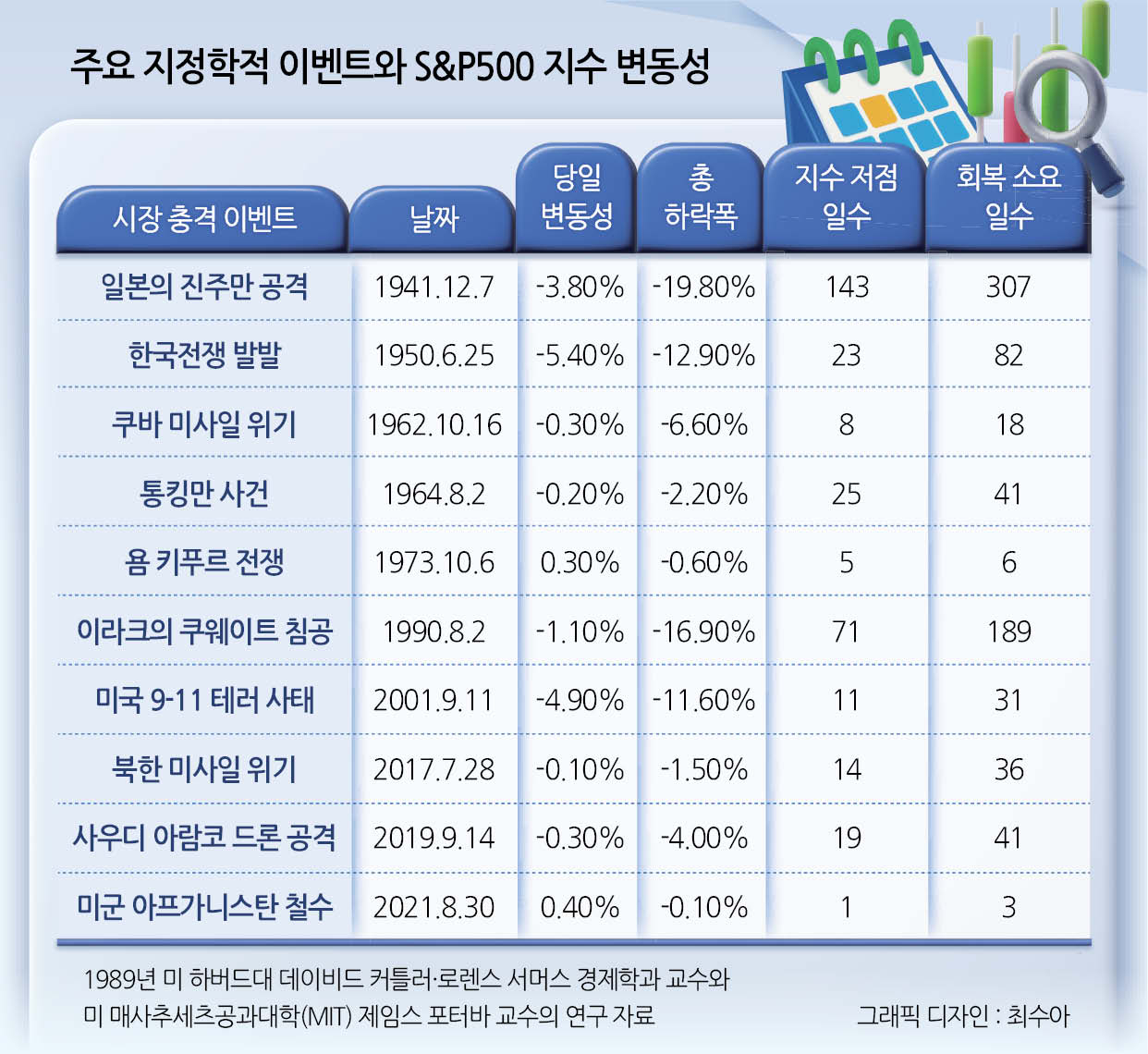 해당 연구엔 태평양 전쟁을 발발시킨 1941년 일본의 ‘진주만 공습’을 비롯해 1950년 한국전쟁, 1962년 쿠바 미사일 위기, 1986년 체르노빌 원전 사고 등 49건의 위기가 포함됐다. 해당 사건이 벌어진 직후 S&P500 지수의 평균 변동률은 1.46%로, 일상 기간 평균 주가 변동률이 0.56%였던 것과 비교한다면 그 격차가 1%포인트 미만이란 게 연구 결과의 핵심이다.