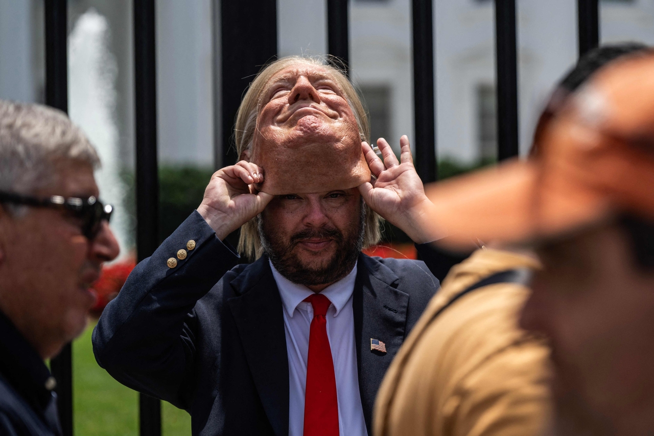 | 한 남성이 22일(현지시간) 미 워싱턴 DC 백악관 앞에서 도널드 트럼프 대통령과 같이 분장해 관광객들에게 인사하다가 휴식 시간을 맞이해 잠시 분장 장비를 벗고 있다. [AFP] |