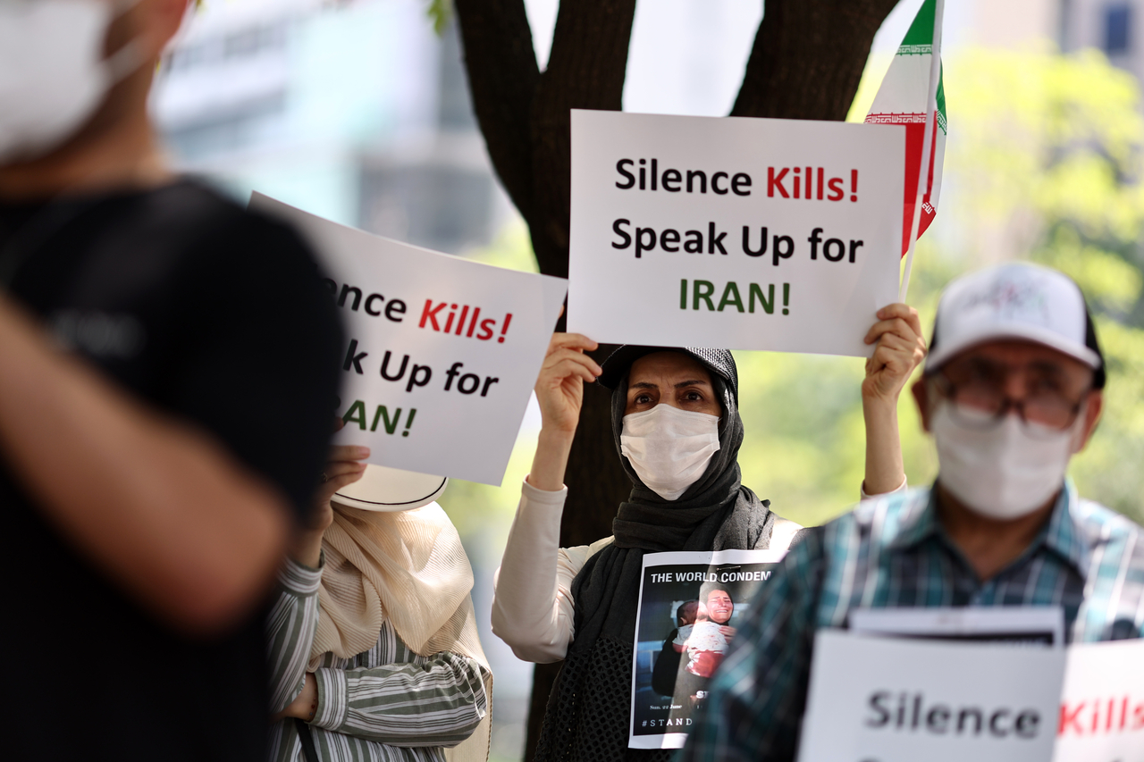 | 22일 서울 종로구 SK서린빌딩 인근에서 재한 이란인들을 비롯한 참석자들이 이란-이스라엘 휴전을 촉구하는 집회를 열고 있다. [연합] |