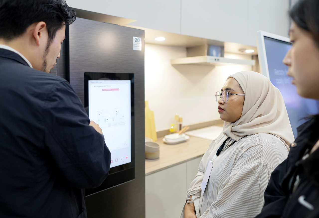 | 20일 태국 방콕에서 열린 동남아 테크 세미나에서 참석자들이 삼성전자 ‘비스포크 AI 패밀리허브’ 냉장고를 사용해보고 있다. [삼성전자 제공] |