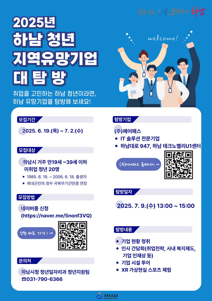 [헤럴드경제=박준환 기자]하남시(시장 이현재)가 지역 대표 유망기업인 ㈜에어패스와 함께 ‘하남청년 지역유망기업 대탐방 프로그램’에 참여할 미취업 청년 20명을 7월 2일까지 선착순 모집한다.