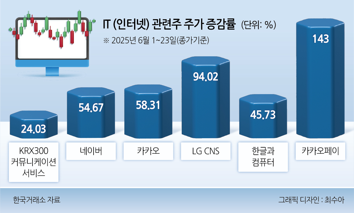 하지만 올해 새 정부의 정책에 따라 인터넷주는 기초역량 개선과 테마성 호재가 동시에 나타나는 중이다. 이재명 정부의 ▷내수 경기 부양 ▷인공지능(AI) 산업 육성 ▷스테이블코인 도입 모두 인터넷 업종에 호재인 것이다.
