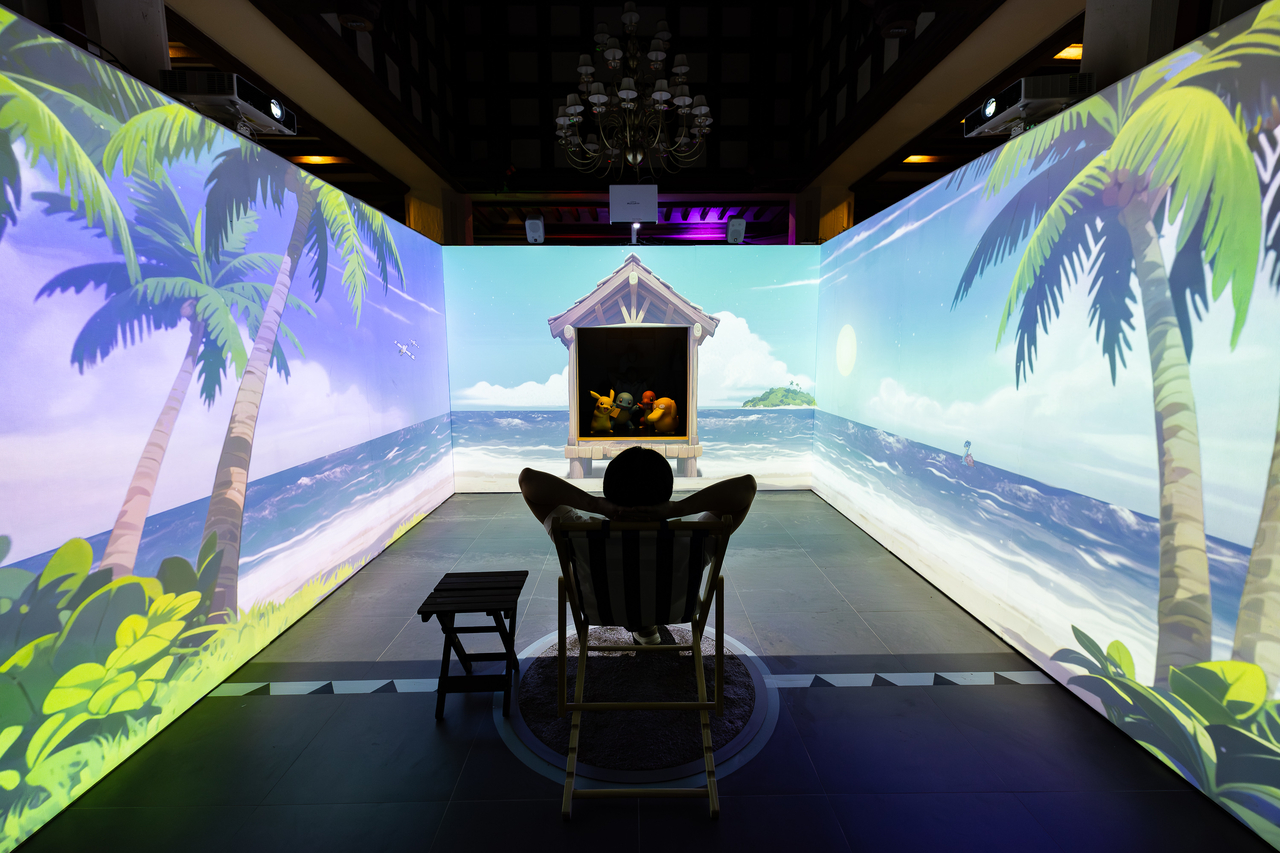 시원한 해변가의 풍경이 벽면과 바닥에 미디어로 연출되어, 마치 포켓몬들과 함께 휴양을 온 듯한 사진을 남기는 것은 물론 물멍까지 즐길 수 있다.