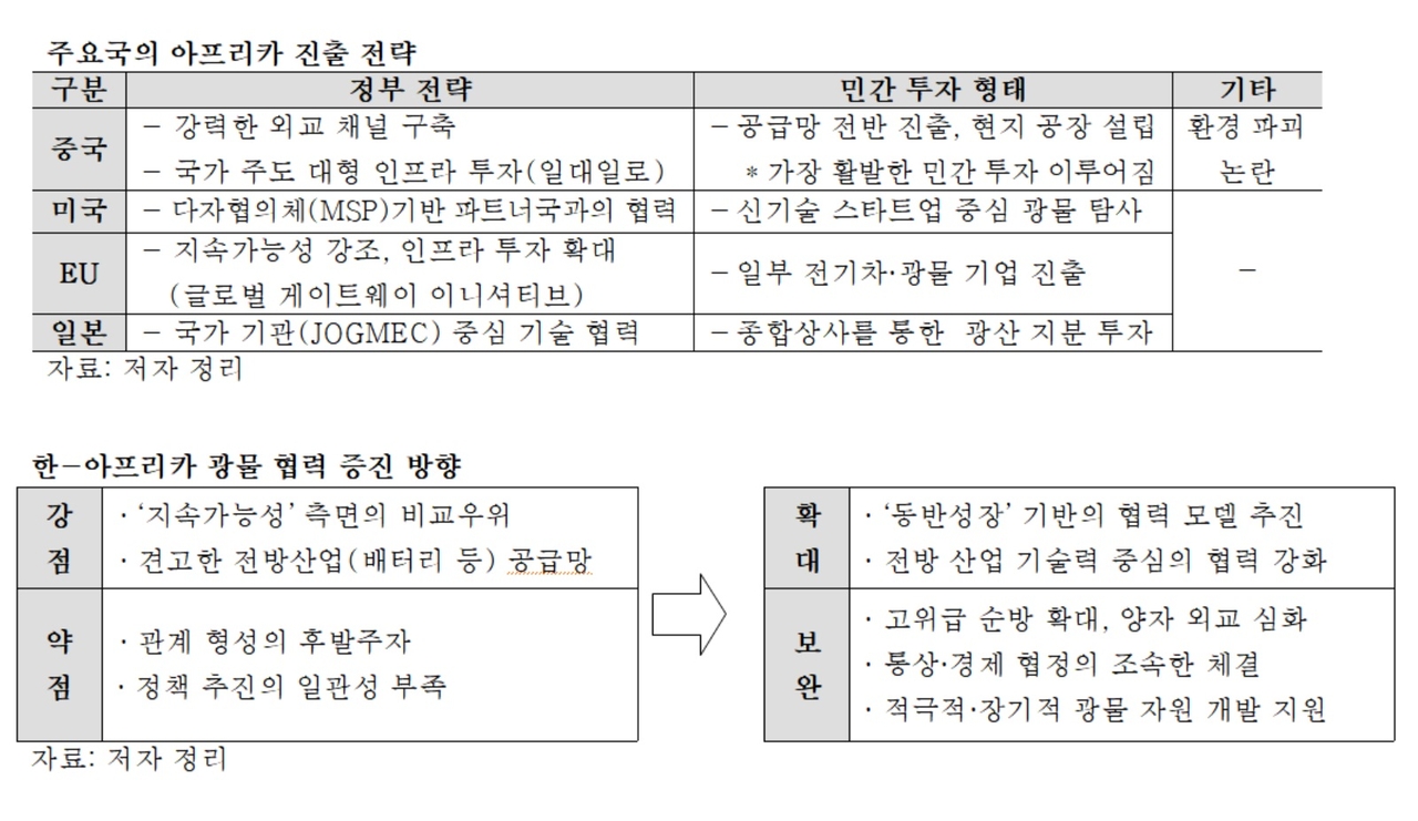 보고서는 “우리나라가 자본력과 외교적 영향력에서는 미국과 중국에 비해 상대적으로 약세지만, 세계적인 배터리 제조 기술력을 바탕으로 견고한 전방 산업 공급망과 지속가능성 측면에서 높은 평가를 받고 있어 아프리카와 광물 분야에서 상호보완적 협력이 가능하다”고 분석했다.
