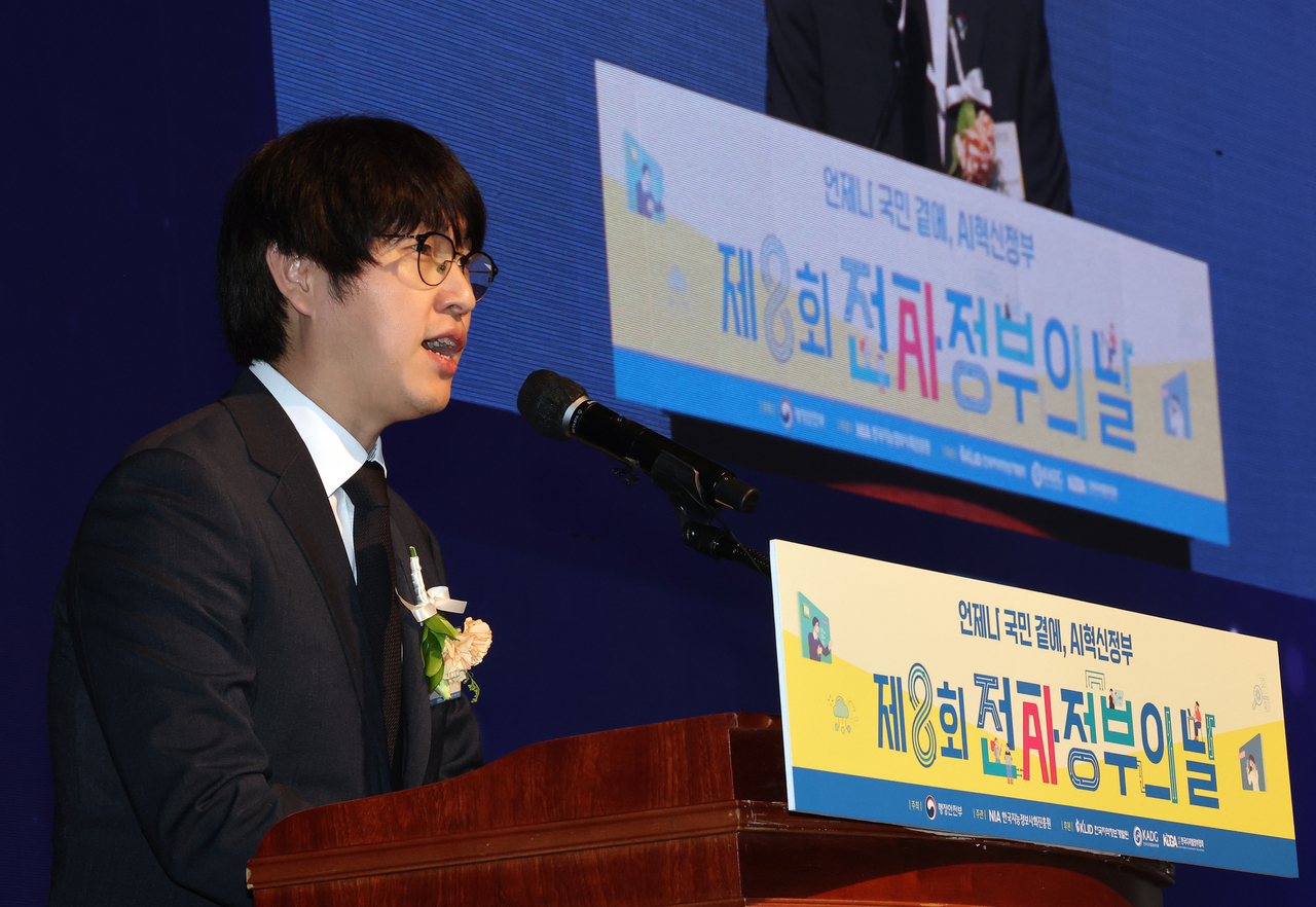 | 하정우 대통령실 AI미래기획수석이 25일 정부세종컨벤션센터에서 열린 제8회 전자정부의 날 행사에서 축사하고 있다.[연합] |