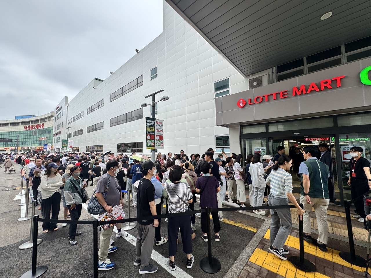 26일 아침 9시 40분께 찾은 경기도 구리시 인창동 롯데마트 구리점 앞은 많은 인파로 북적였다. 매장이 열리기 20분 전이었지만, 무려 1000여명이 몰렸다. 구리시 내 유일한 대형마트가 다시 문을 연다는 소식에 아침 일찍부터 ‘오픈런’이 펼쳐진 것이다.